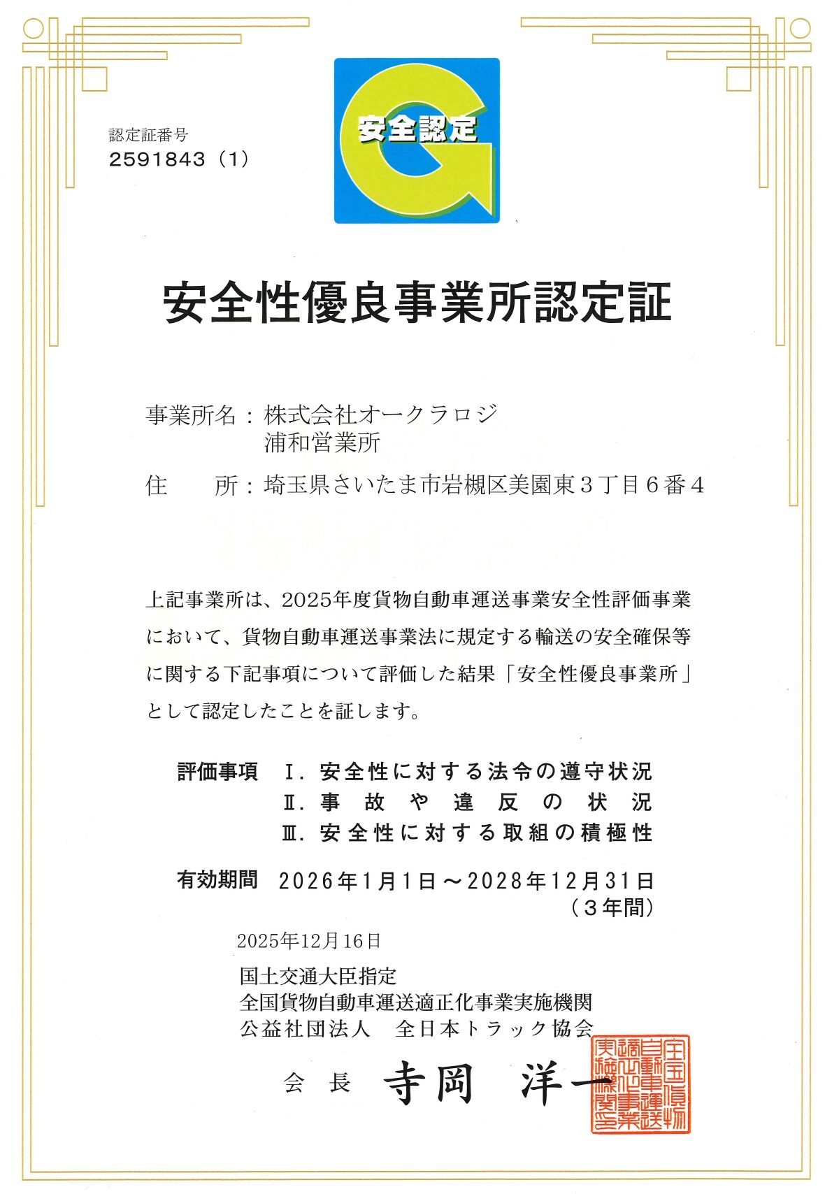 【浦和営業所】安全性優良事業所認定証(Gマーク)を更新
