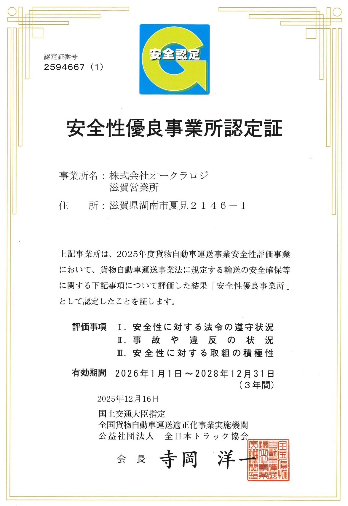 【滋賀営業所】安全性優良事業所認定証(Gマーク)を更新