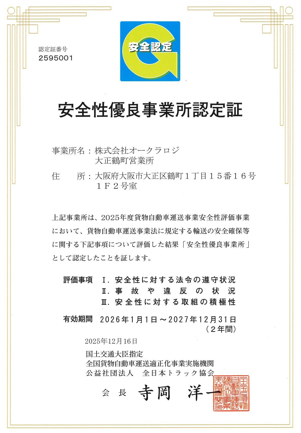 【大正鶴町営業所】安全性優良事業所認定証(Gマーク)を新規取得