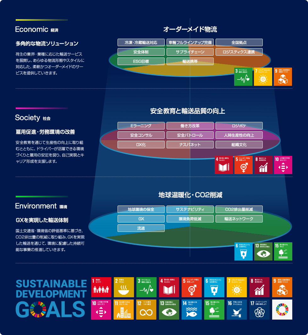 物流課題の解決に取り組み、荷主の皆さまに最適な物流サービスを提供するとともに、環境・社会・経済の観点から持続可能な物流ソリューションを推進してまいります。